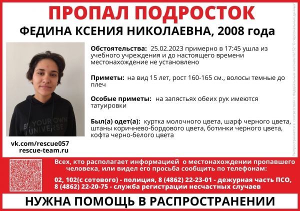 2 года назадПропавшую 14-летнюю воспитанницу Некрасовской школы-интерната Ксению Федину нашли живой. Такая информация появилась в официальной группе ВК поисково-спасательного отряда «Сармат». Сообщалось, что девушка пропала вечером 25 февраля.
