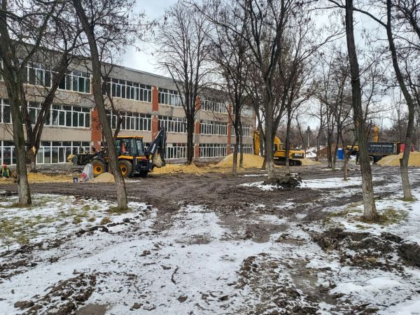 Дальше школа. И здесь работы кипят. С подрядчиками обсуждаются вопросы благоустройства территории. По проекту около школы будет построено несколько спортивных площадок.